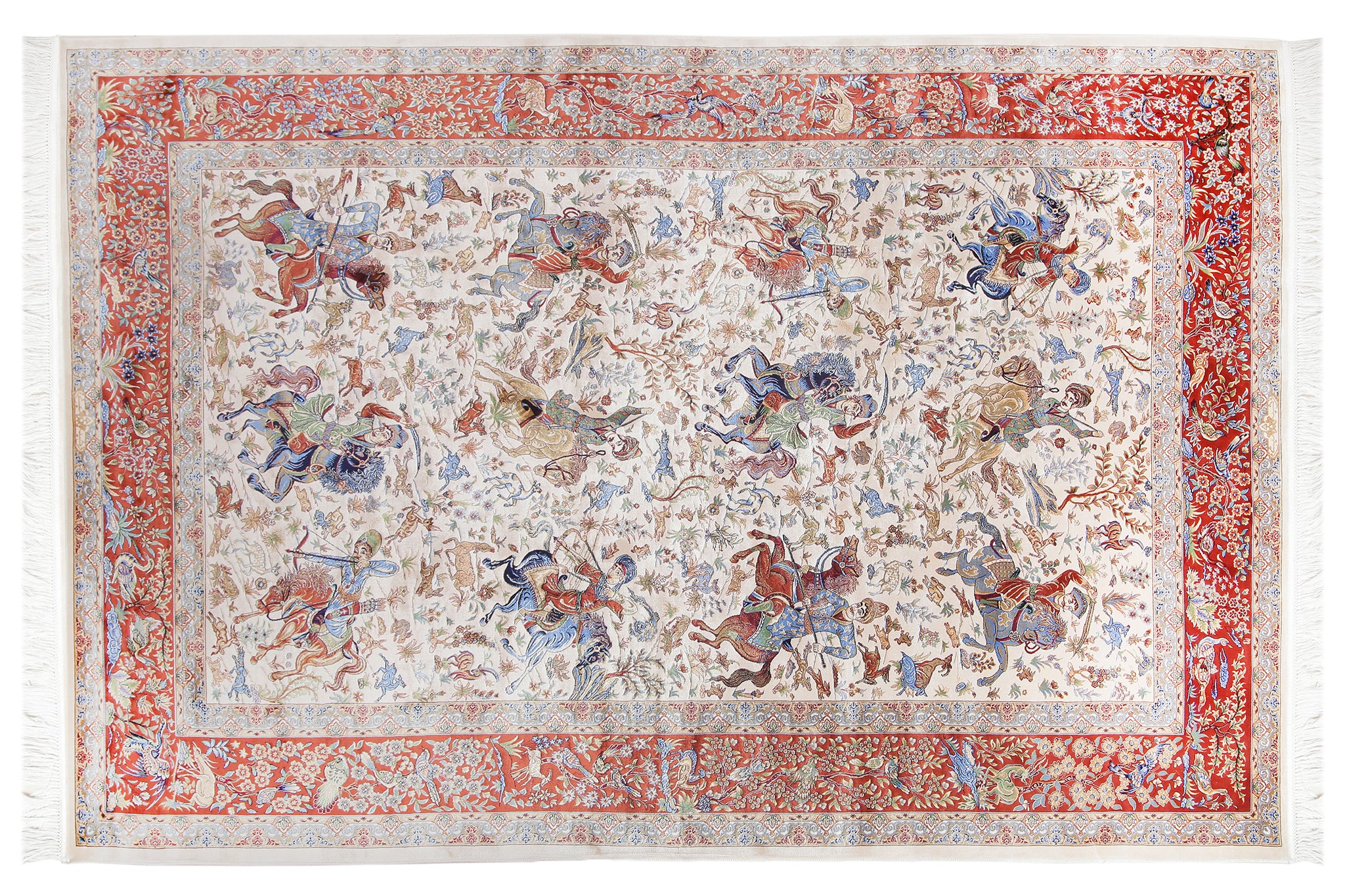 Immerse yourself in a world of adventure with our Ivory Hunting Scene Silk and Woolen Rug. Its exquisite depiction of a hunting scene brings to life the grandeur of nature and the thrill of the chase, creating a captivating narrative right in your living space.